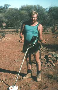 593 Gramm Goldnugget 20. George und das Hill Patch | | | | | | | | | | | | | | | | | | | Inzwischen waren ungefähr 4 Wochen seit meiner Ankunft in den Yalgoo Goldfields vergangen, in denen ich mit meinem -Gold Bug - Metalldetektor den Busch nach neuen Patchen durchstreift hatte. Ich war auf dem besten Weg ein echter - bushy - zu werden. Ich kannte mich in der näheren Umgebung recht gut aus und auch im Busch war es kein Problem mehr, konzentriert mit dem Metalldetektor unterwegs zu sein, ohne sich zu verlaufen. Meine Orientierung wurde immer besser. Ich untersuchte alte stillgelegte Minen und fand hier und da immer mal wieder ein Nugget. Im Durchschnitt schaffte ich es ca. 1 Gold - Unze (31,1Gramm) Nuggets in der Woche aufzuspüren. Am Abend schaute ich mir immer noch mal an, was Matt den Tag über erreicht hatte und ging auch hier noch meist mit meinem Gold bug über die von Matt freigeschobenen Patche. Matt benutzte einen Minelab 17000 Detektor. Dieser ging viel tiefer und brauchte alle 2-3 Tage, 6 neue 1,5 Volt Batterien. Mein Gold bug hatte zwei 9 Volt Batterien mit denen ich bis zu drei Wochen jeden Tag gehen konnte. Auch war er sehr viel sensibler als der Minelab und man konnte bei konzentrierter Arbeit bis zu o,1 Gramm Nuggets finden. Matt war es eigentlich egal, daß ich abends noch mal über den von ihm detekteten Grund ging. Er sagte: " Get the fly shit "und er bekam sowieso die Hälfte davon. Trotzdem war es immer noch ein gutes Gefühl, wenn man am Abend, nach einem erfolglosen Tag im Busch noch ein paar kleine Nuggets auflesen konnte. Manchmal arbeitete Matt auch unkonzentriert und übersah Nugetts von bis zu zwei Gramm.